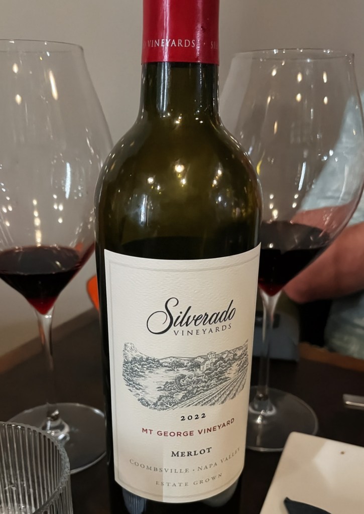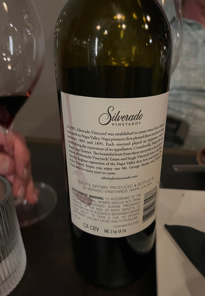 Here I am raving about the food when we’re really here for the wine! We chose a bottle of 2022 Silverado Mt. George Vineyard Merlot—moderately priced, super smooth, nice body, and shockingly enjoyable for someone who usually doesn’t love Merlot. It paired beautifully with everything on the table. I’d definitely order it again!